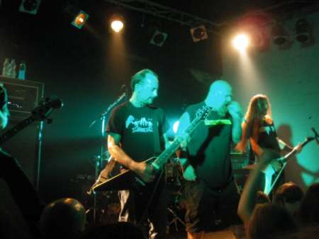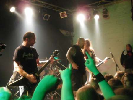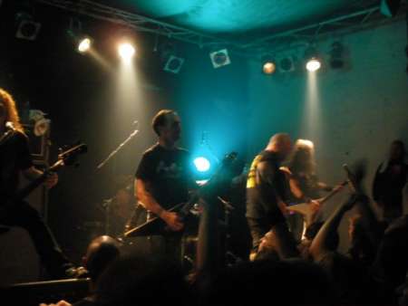 Von Anfang an gibt es keine Kompromisse, Rob fordert die wilde Meute dazu auf, den Moshpit bloss nicht aufhören zu lassen, Rick Hunolt spielt als wäre er niemals aus der Band ausgestiegen und Tom Hunting, dem einzigen Original Mitglied auf der Bühne, drischt dermassen auf sein Drumkit ein, dass man schon Angst bekommen muss. Man bekommt den Eindruck, dass da eigentlich niemand auf der Bühne fehlt und eine Ansage von Rob Dukes, die zwar unverständlich ist, hört sich fast an wie eine kleine Schimpftirade auf Gary Holt. Aber dafür will ich hier nicht meine Hand ins Feuer legen. Ein paar Songs vor Schluss wird dann noch der augenscheinlich jüngste Fan an diesem Abend, der mit seinem Vater hier ist, auf die Bühne geholt. Der Junge war 13 und Mr. Dukes huldigt ihn mit den Worten als "The next Generation of Thrash Metal".
